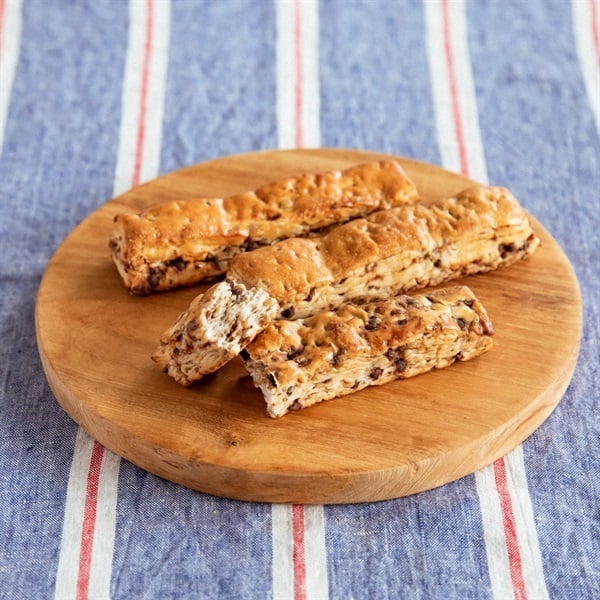 十六穀とオーツミルク、パネトーネ種を配合したふんわり生地に、ベルギー産チョコレート入りのクリームと、チョコチップを合わせたスティック形状のパンです。